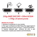 Example: if a dog weighs 30kg, the daily ration will be approximately 600g (assuming a percentage equal to 2% of body weight). So, simply take 200g of Easy Dry dry food, rehydrate it with 400g of water, wait about 30 minutes, and obtain a final meal of 600g.